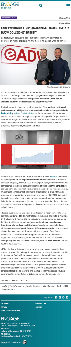 eADV raddoppia il giro d'affari nel 2020 e lancia la nuova soluzione "infinity"